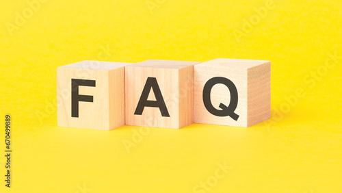FAQ - Frequency Asked Questions symbol. wooden cubes with words. beautiful yellow background. business and FAQ concept. copy space.