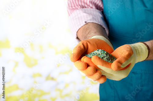 Farmer shows fertilizers in his hands weared in gloves