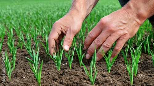Farmer's hands carefully cultivate young seedlings in a field.