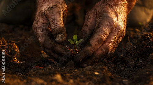 Farmer’s Hands Planting Seedling in Fertile Soil Farmer Hands, Planting Seedling, Agriculture Growth, Organic Farming, Sustainable Agriculture, Gardening Close-Up, Rich Soil Texture, generative ai