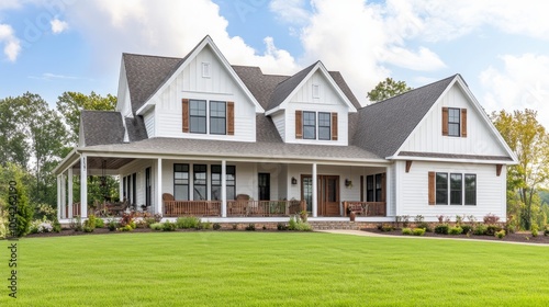 Farmhouse Style House with Wrap-Around Porch - A farmhouse-style house isolated on a white background, featuring a large wrap-around porch, rustic wood siding, and a gabled roof.
