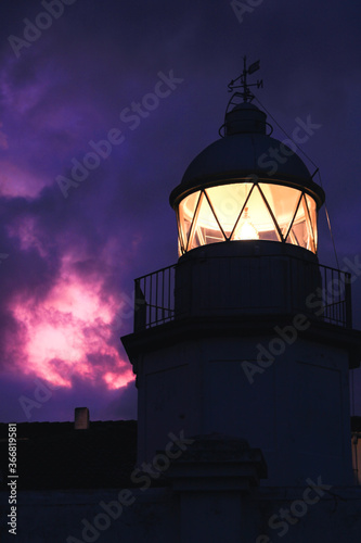 Faro con un cielo magenta brillante en Llanes, Asturias, España