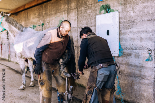 animal, apron, barn, blacksmith, blurred background, tied-up, care, colleague, countryside, employee, farrier, forge, glove, hand-made, handiwork, handyman, hoof, horse, horseshoe, instrument, iron, job, male, mammal, man, metal, metalwork, occupation, process, professional, protect, put on, ranch, service, stable, stall, fast horse, racked, steel, together, tool, work, men at work, working man, workwear