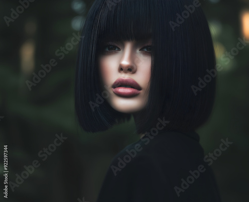 Fashion editorial Concept. Closeup portrait of black hair sensual bob fringe woman on foliage dark leafy jungle background. copy text space