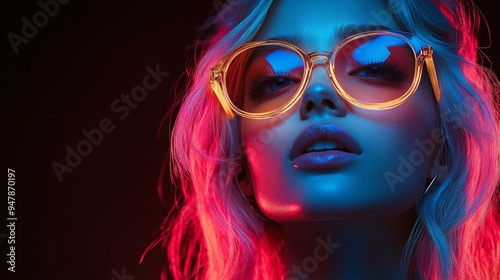woman, model, fashion, beauty, sunglasses, neon, light, pink, hair, blue, red, portrait, studio, posing, glamour, style, trendy, colourful, vibrant, glowing, nightlife, clubbing, party, music, entertainment, youth, culture, stylish, attractive, confident