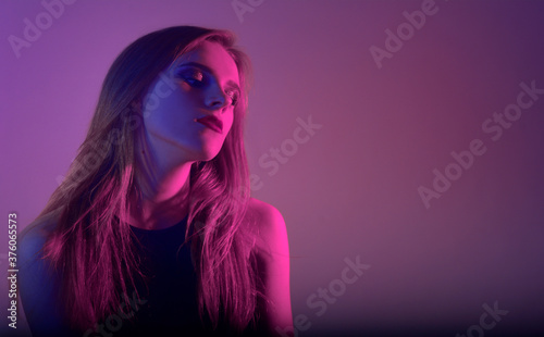 Fashion portrait of young elegant girl Colored background, studio shot. Beautiful woman with red lips. Girl in neon. Woman with stylish hair. Girl with trendy make-up. Art design, colorful make up.