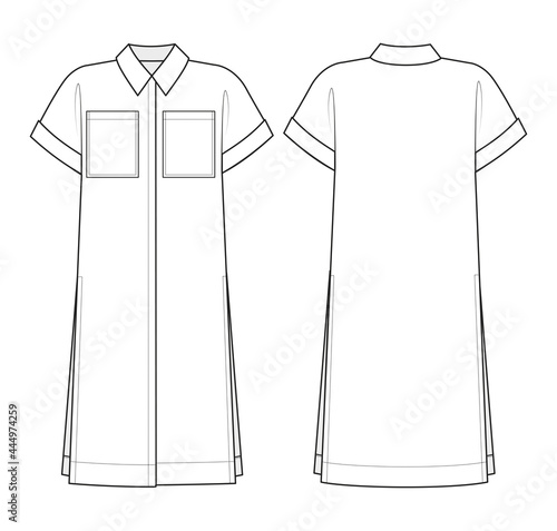 technical, garment, silhouette, cad, drawing, trendy, stitching, black-and-white, oversize, collar, pocket, dress, shirt, fabric, style, cotton, wear, clothes, apparel, casual attire, illustration, template, clothing, textile, fashion, design, vector, front