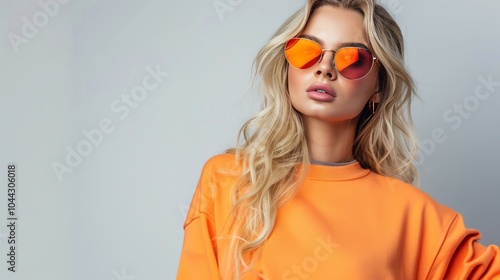 Fashionable confident blonde woman wearing trendy orange sweatshirt, color sunglasses, posing on white background. Copy, empty space for text