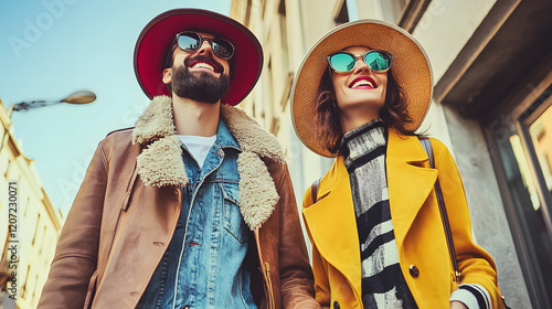 couple, fashion, sunglasses, hat, urban, style, happiness, summer, joy, confident, portrait, trendy, lifestyle, walking, friendship, smile, sunshine, colourful, clothing, leisure, cheerful, accessory, romance, city, people, bright, fun, beautiful, jacket, coat, vibrant, casual attire, casual clothes, fashion accessories, human relationships, modern, atmosphere, youthful, sunny day, strolling