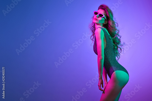 Fashionable glamour woman with Trendy wavy neon hairstyle. Party night club vibes. Excited shapely sexy girl in Stylish outfit, sunglasses. Bright pink purple light. Art fashion neon color.