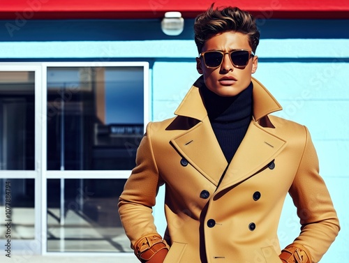fashion, menswear, style, outerwear, modern, minimalist, sunglasses, winter fashion, man, urban, elegance, sophistication, male model, luxury, haute couture, contemporary, trendy, chic, refined, classic, polished, turtleneck, confidence, beige, upscale, editorial, sleek, posh, tailored, stylish, fashionable, portrait