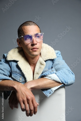 accessory, adult, background, caucasian, chair, clothes, clothing, colours, confidence, confident, cool, denim, elegance, elegant, fashion, fashionable, glamour, goggles, grey, photogenic, hipster, jacket, lifestyle, look, luxury, male, man, model, modelling, modern, outfit, party, person, portrait, pose, posing, studio, style, stylish, success, trend, trendy, vertical, vogue, wear, wearing