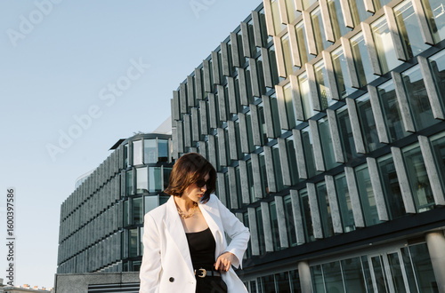 business, fashion, blazer, urban, architecture, modern, professional, confident, contemporary, sleek, city, glasses, skyscraper, stylish, elegance, chic, model, editorial, minimal, sunlight, corporate, structure, feminine, power, highrise, city landscape, businesswoman, modernism, structured, lifestyle, upscale, daylight, sharp, poised, silhouette, confidence