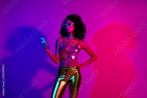 Fashionable woman with a stylish metallic outfit and sunglasses holding a smartphone, illuminated by vibrant neon purple and pink lights