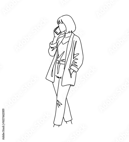 line art, woman, young, stylish, phone, call, talking, fashion, casual attire, lifestyle, communication, modern, mobile, device, chatting, conversation, elegant, trendy, street, connected, vignetting, illustration, drawing, people, vector, art, model, person, cartoon, line, lady, silhouette, dress, black, couple, style, clothing