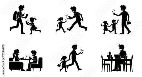 father, daughter, children, girl, boy, children, father, eltern, family, running, mobile phone, smartphone, tablet, device, backpack, people, person, vector, icon, silhouette, flat, illustration, design, isolated, white background, happy, smiling, cheerful, joyful, playful, chasing, looking, digital, technology, communication, connection, modern, lifestyle, activity, togetherness, human relationships, care, love, childhood, youth, education, learning, fun, leisure