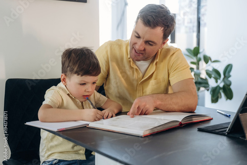 father, son, children, desk, indoor, study, book, education, learning, plant, window, light, sitting, table, paper, crayons, writing, attention, sharpened, casual attire, home, family, together, interaction, workspace, furniture, room, modern, bright, open, page, notebook, stationary, portrait, casual clothes, yellow, shirt, jean, expression, engaged, reading, teaching, guidance, activity, childlike, youthful, domestic, environment, natural