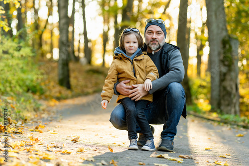 father, son, man, boy, children, children, family, autumn, fall, forest, park, tree, leaf, yellow leaf, nature, bonding, together, pathway, jacket, hoodie, beanie, jean, sneaker, sunglasses, parenting, fatherhood, casual clothes, sunlight, golden hour, walk, timberland, peaceful, natural light, squatting, portrait, fall scene, embracing, relaxed, weekend