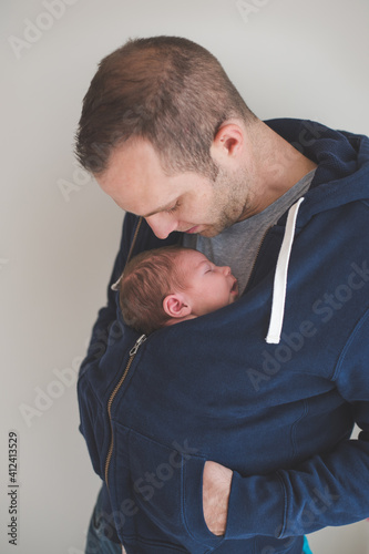 Father carrying his newborn son on his chest covered with a jumper