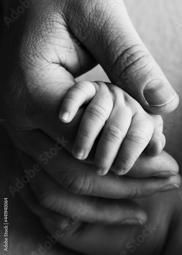 Father holding newborn baby's fingersnewborn . Hand of a newborn baby. Hands of parents and baby closeup. Black and white photo.