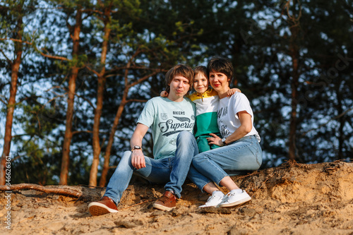 Father mother and son sit on a sandy cliff against the background of the forest