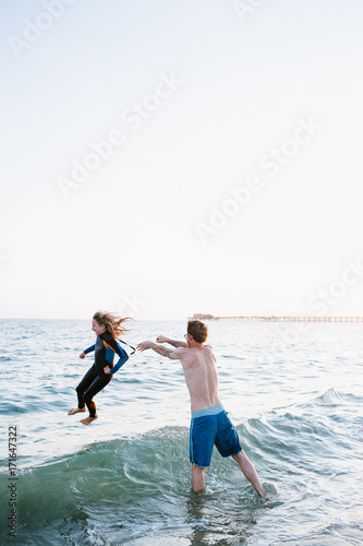 wetsuit, throw, summer, playful, ocean, fun, father, daughter, father, california, caucasian, white, male, person, people, adult, adult, 30s, grown-up, girl, female, children, children, children, children, preteen, preteen, preteen, teenage, youth, youth, youngster, youngster, minor
