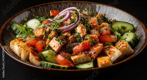 Fattoush Salad. Traditional Lebanese Salad with Eastern Herbs and Vegetables on Plate