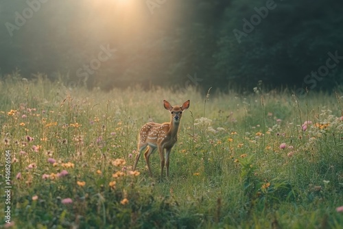 Fawn exploring a flower-filled meadow at dawn near a forested area