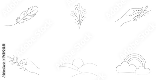 feather, quill, bird, wing, flower, bloom, blossom, daisy, hand, finger, holding, tree branch, leaf, nature, landscape, hill, sun, sunrise, sunset, rainbow, cloud, sky, outline, line art, minimalist, simple, graphic, drawing, illustration
