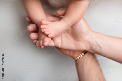 feet in parents hands on white background. newborn baby foot
