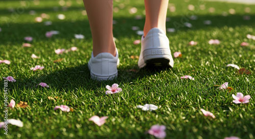 Feet in white sneakers walking on spring petal covered grass path detail.