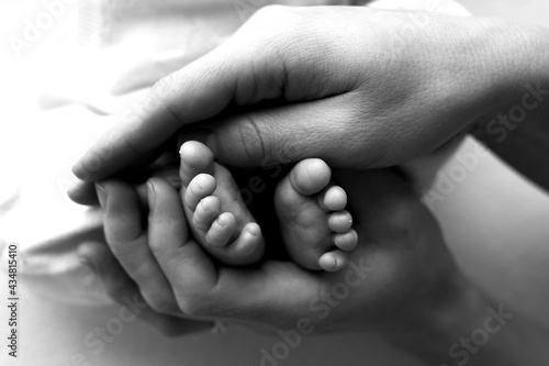 Feet of a newborn in the hands of a father, parent. Studio photography, black and white. Happy family concept.