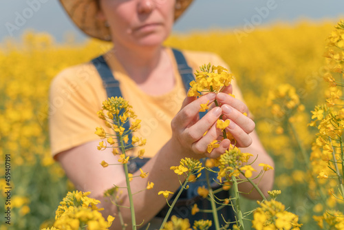 Female agronomist checking up on development of rapeseed crops in field, woman working on plantation