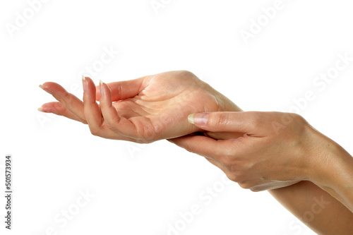 Female beautiful hands closeup. Skincare concept on white background
