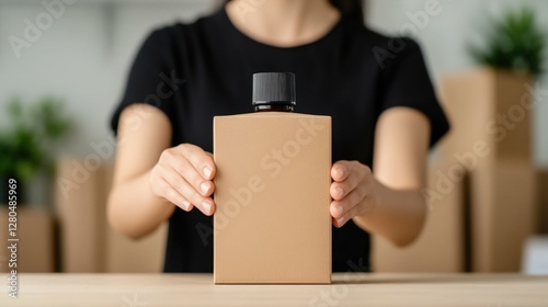female, caucasian, adult, hand, cardboard, box, bottle, table, cardboard box, product, shipping, logistic, delivery, person, black, plant, background, indoor, sharpened, presentation, business, commerce, storage, wrapping, environmentally friendly, recyclable, container, desk, workspace, preparation