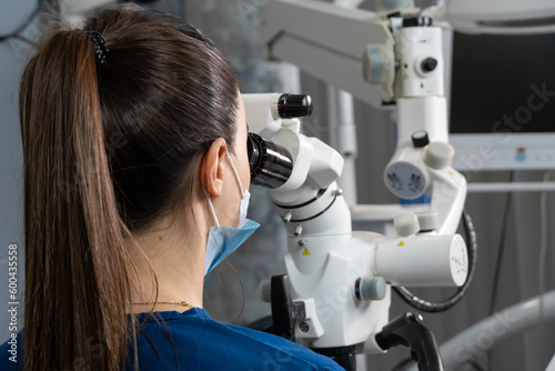 Female dentist using dental microscope treating patient teeth dental clinic office. undergoing treatment by experienced dentist using microscope. Image of woman on patient's chair in dentist's office.