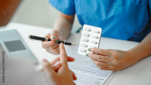 Female doctor provides crucial guidance to male patient in clinic room, discussing heart attack, appointment desk. explanation of capsules, how to use them, and dangers if the dosage is exceeded.