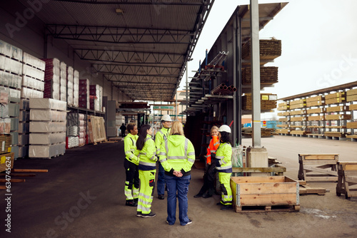 Female engineer discussing with multiracial colleagues at industry