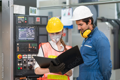 Female Engineer wearing face mask with safety vest and protective helmet with male engineer looking document operating control CNC Machinery at factory Industrial