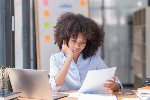 Female Entrepreneur. Cheerful African American Businesswoman Working On document and Laptop In Modern Office. Empty Space
