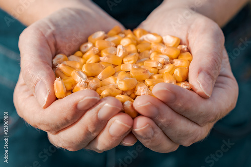 female, farmer, handful, harvest, corn, grain, seed, kernel, cornfield, closeup, woman, agronomist, peasant, one person, people, caucasian, agriculture, agricultural, nature, harvested, maize, crop, plenty, abundance, yellow, cupped, hand, jean