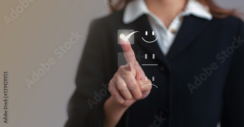 Female finger pointing and touching on satisfaction survey icon blurred background.
