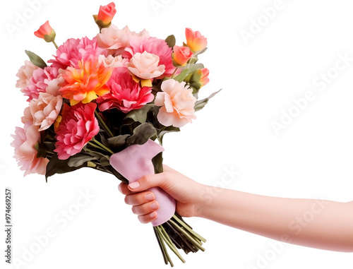 Female hand holding A bouquet of flowers PNG isolated on white and transparent background - Flower offering gift delivery and holiday greetings Love Concept