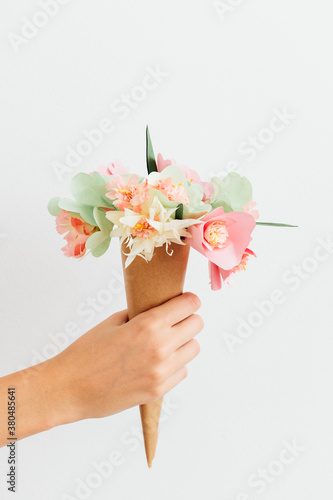 bricolage, woman, valentine, romantic, present, pastel, paper, holding, hand, giving, gift, flower, floral, female, decorative, decoration, decor, creative, bouquet, caucasian, white, girl, person, people, adult, adult, 20s, young adult, young adult, young person, grown-up