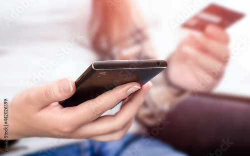 smartphone, credit card, buying, pay, hand, shopping, sale, discount, retail, finance, credit, small business, shopaholic, front view, selective focus, defocused, woman, closeup, mobile phone, holding, wireless technology, portability, indoor, office, business, modern, communication, lifestyle, working, loan, ordering
