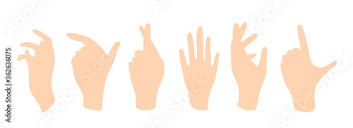 Female hands showing gracefully different poses and signs. Vector illustration in flat style hand drawn isolated on bright. Light silhouettes of palms and a pink silhouette, crossing fingers.