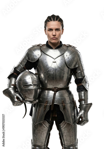 Female knight in plate armor holding helmet isolated. Fantasy warrior concept.