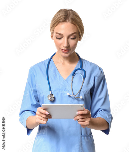 Female medical assistant with tablet computer on white background