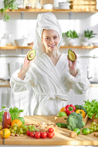 Female on diet. Young and happy woman in bathrobe showing green fresh ingredients indoors