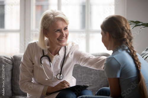 Female pediatrician putting hand on young schoolgirl patient shoulder.
